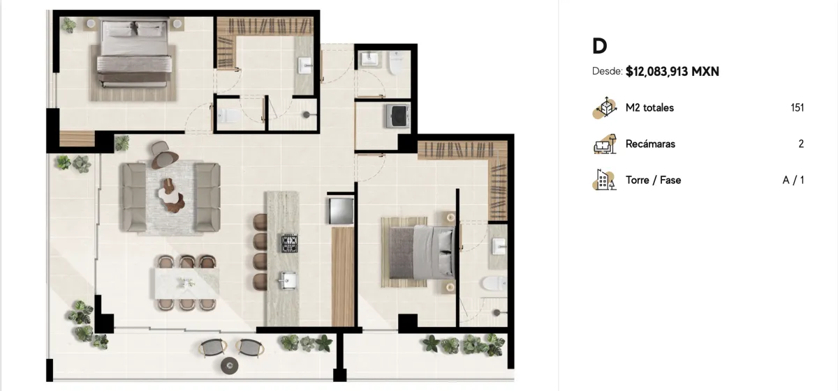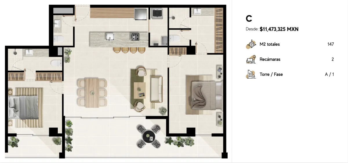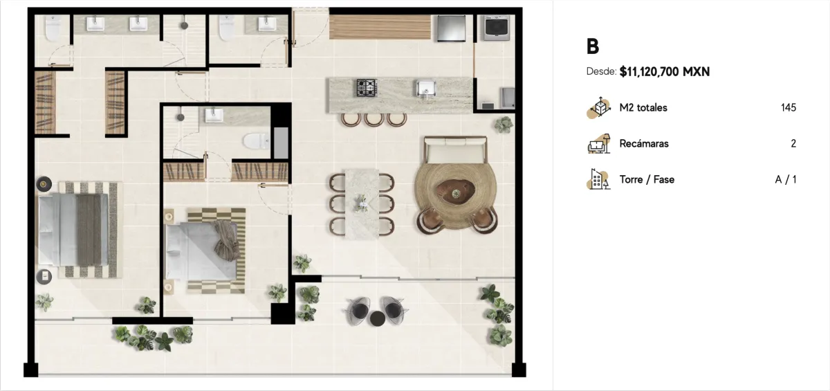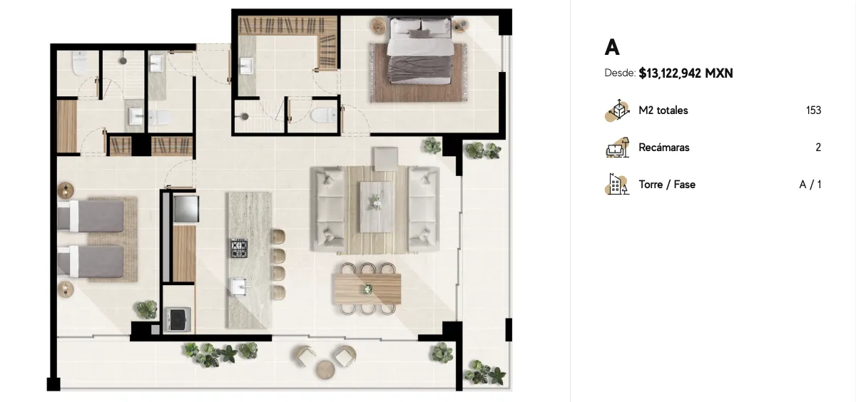 El desarrollo cuenta con 32 departamentos de lujo con diseños modernos, acabados de alta calidad y distribuciones que van desde los 145 m² hasta más de 250 m², incluyendo penthouses con rooftop privado y alberca.